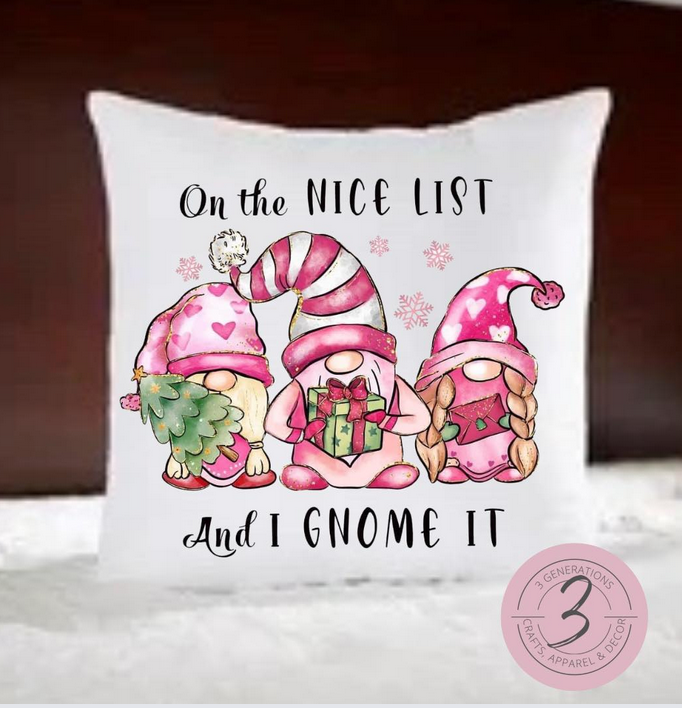 On the Nice List and i Gnome it 14 by 14 inch pillow
