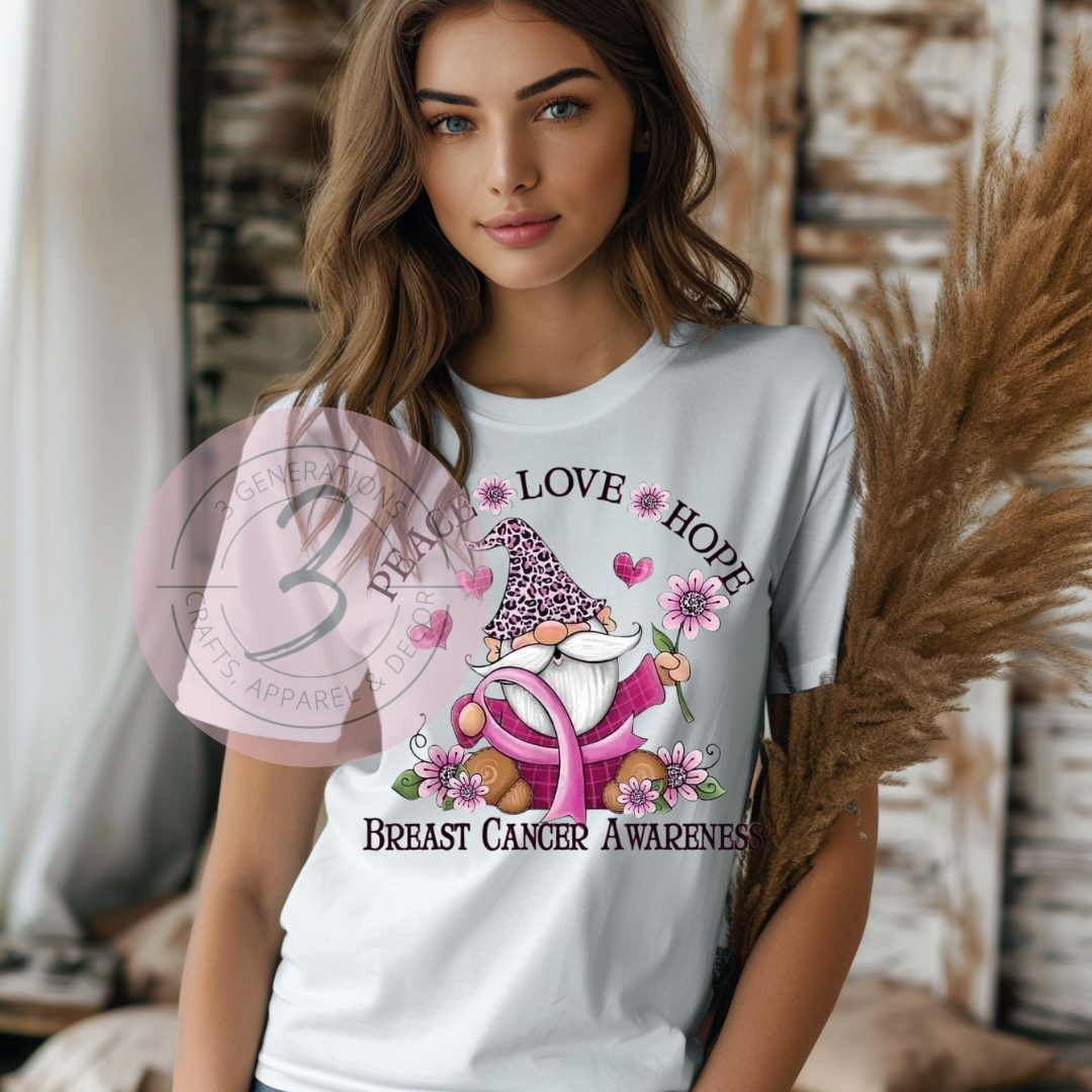 Peace, Love, Hope Breast Cancer Gnome Graphic Tee